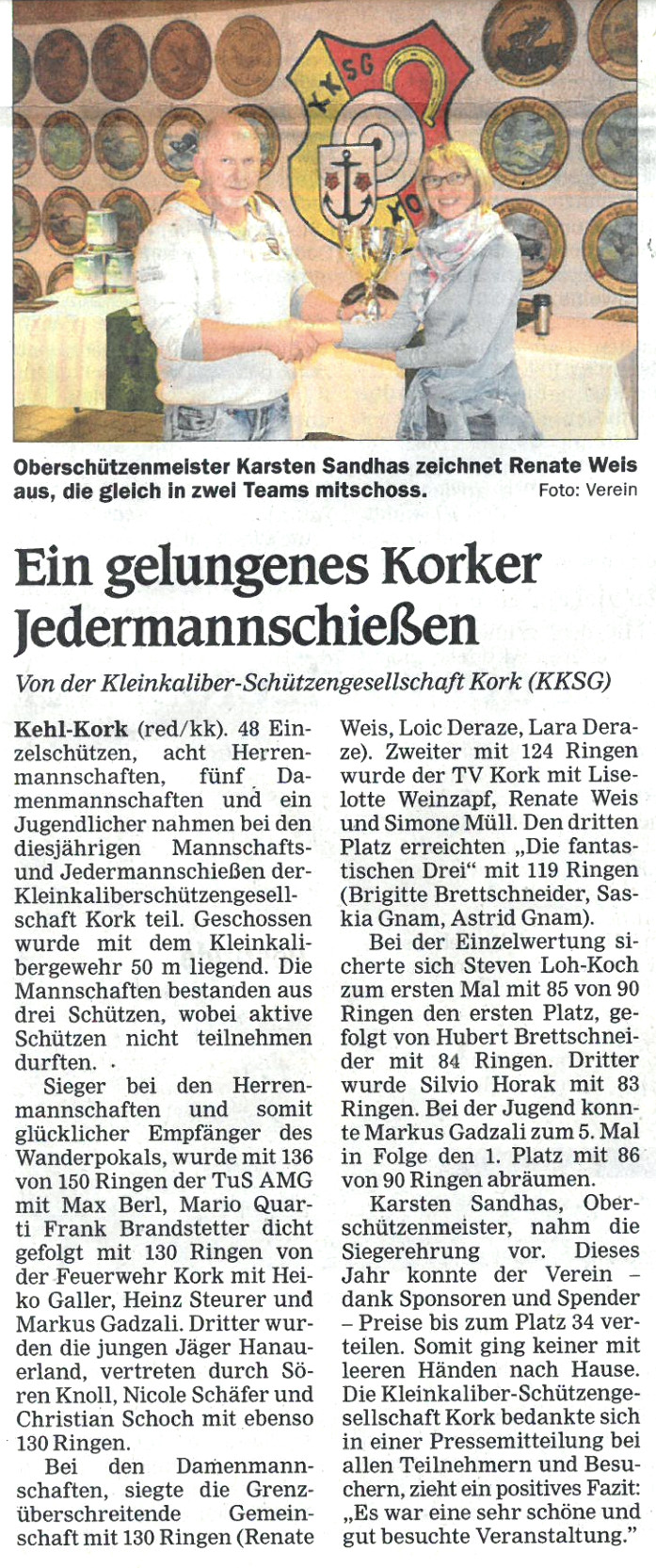 Kehl-Kork. 63 Einzelschützen, 15 Herrenmannschaften, 3 Damenmannschaften und 5 Jugendliche nahmen am Mannschafts- und Jedermannschießen der Kleinkaliberschützengesellschaft (KKSG) Kork teil.