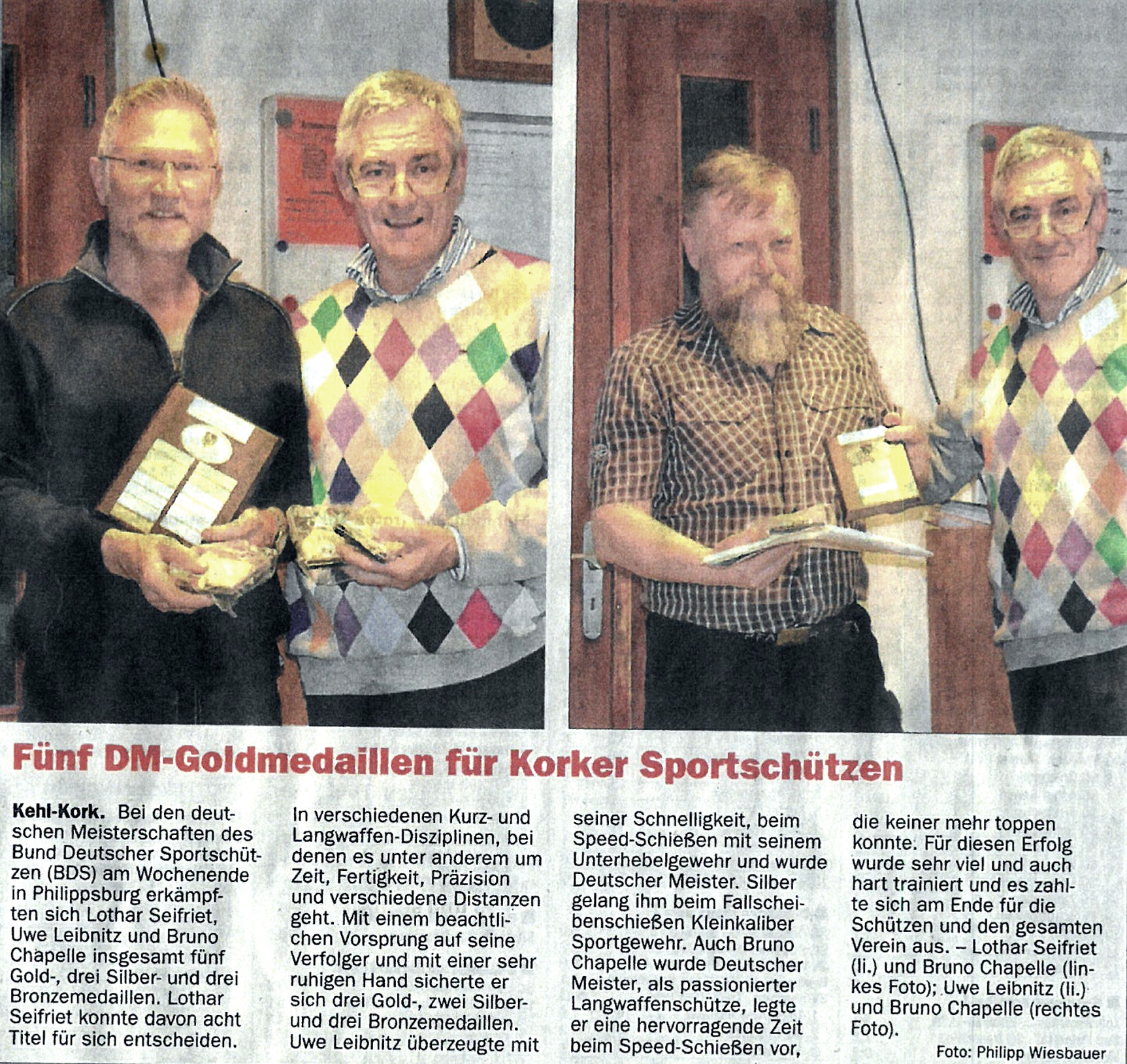 Kehl-Kork. Die Schützen der KKSG Kork feiern Ihre Deutsche Meister. Foto: Uwe Leibnitz (links) und Lothar Seifriet (rechts)