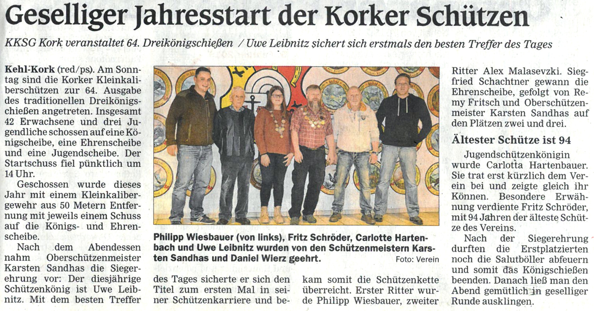 Kehl/Kork - Bei der Generalversammlung der Kleinkaliber-Schützengesellschaft (KKSG) Kork am Freitag, 2. März, gab es einen Wechsel im Vorstand: Karsten Sandhas wurde zum neuen Oberschützenmeister gewählt, den dadurch freiwerdenden Posten als Schützenmeister übernahm Daniel Wierz. Richard Jockers stellte seinen Posten als Oberschützenmeister nach zehn Jahren zur Verfügung ...