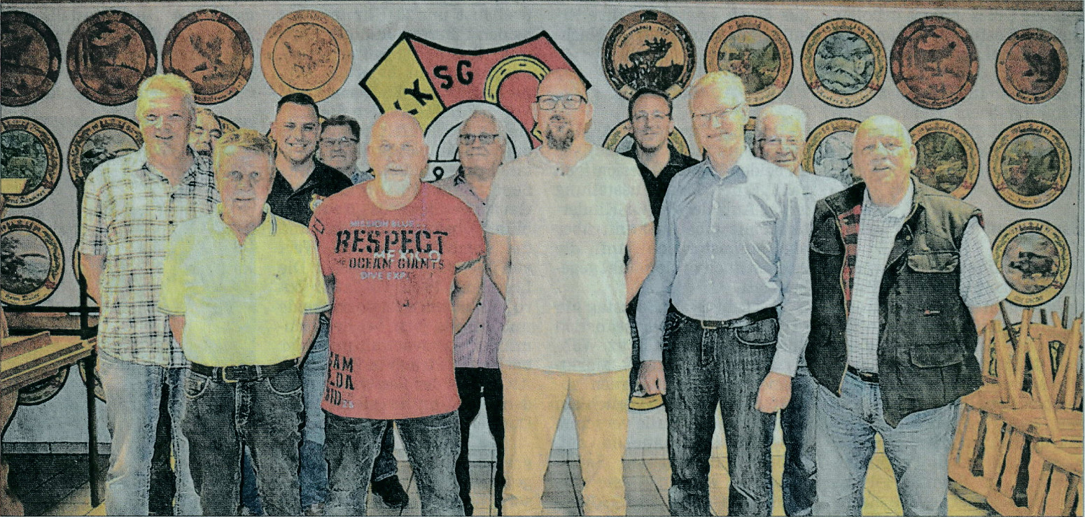 Ein Teil der neu gewählten Vorstandschaft (von links, Reihe hinten): Bruno Chapelle, Philipp Wiesbauer, Lothar Hartenbauer, Richard Jockers, Daniel Wiertz, Manfred Rauscher. Reihe vorne: Roland Riedl, Werner Siehl, Karsten Sandhas, Oliver Glatt, Matthias Gründler und Sigfried Schachtner. (Foto: KKSG Kork)